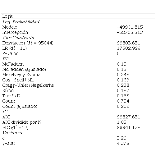Martínez, et al (2009) destacan que el criterio de información de Akaike proporciona un método simple y tienen como objetivo determinar el modelo más apropiado para seleccionar datos de prueba. Este criterio se define, en el contexto de la teoría de la información, como: AIC = −2 log(L(θb)) + 2K, en el que el logaritmo de la máxima verosimilitud concuerda con el valor de los parámetros libres y K es el número de parámetros libres del modelo estadístico. Este término estima la diferencia del mecanismo y el modelo que efectivamente producen los datos observados, siendo incógnito y en circunstancia inviable de calificar. Dado que la valoración se basa en pruebas experimentales, este rango siempre es limitado y depende del grupo de datos de prueba. De modo que, un solo valor de AIC no se puede interpretar por sí mismo y los valores de AIC son razonables en el momento en que se efectúan comparaciones. Siguiendo este fundamento, los resultados recomiendan que para este tipo de estudio el mejor modelo es Logit por su menor valor en comparación al resultado obtenido del mismo criterio en un modelo Probit.(Cuadro 02)