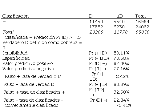 A través del análisis diagonal principal, el modelo acertó en 11 454 y 6 230 observaciones; esto proporciona una sensibilidad de que existe una alta influencia de los activos en la pobreza en un 80,11%. Asimismo, se analizó que por medio de la diagonal secundaria se ha clasificado de la siguiente manera el 17 832 y 5 540 de observaciones que el modelo no acertó; lo que da una especificidad de acierto del 70,58%. Entonces, en el modelo se obtuvo una correcta clasificación del 71,45% de las estimaciones, se interpreta que de cada 100 individuos o encuestas 71 están siendo estimadas correctamente (INEI, 2019).(Cuadro 03)