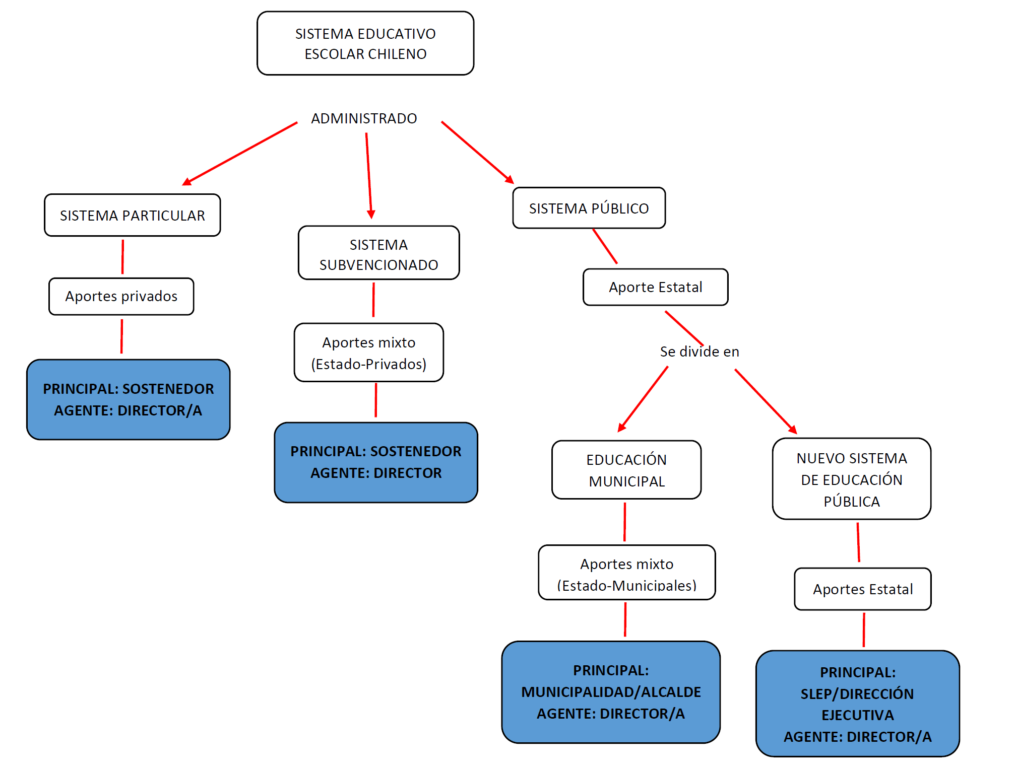 Para empezar, se muestra la Figura N°3, la cual intenta representar -desde la TA- la correspondencia “principal” y “agente” que se da en el sistema escolar chileno. Es importante recordar que este sistema educativo se compone de cuatro categorías, las cuales dependen de quien o quienes administran la educación; tales categorías a las que se hace mención son: