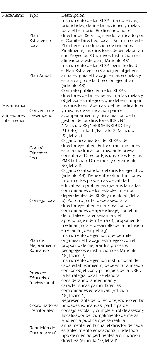 Por otra parte, los mecanismos alineadores intermedios, los cuales establecen y regulan la relación que existe entre los directores ejecutivos y directores de establecimientos educacionales, están expuestos en la Ley 21.040.