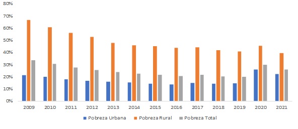 La pobreza monetaria en Perú para el 2021 fue de 25.9 % (véase la Figura 1) que perjudicó a más de ocho millones de personas. En comparación con el 2020, año en que el COVID-19 provocó una crisis en el mercado de trabajo, que afectó a los estratos con menores ingresos y trabajadores del sector informal. El índice de la pobreza monetaria en 2021 disminuyó 4.2 %, debido a la reducción de restricciones para mitigar el COVID-19; no obstante, en la zona urbana la pobreza del 2021 fue similar al comportamiento del 2009 (INEI, 2022).