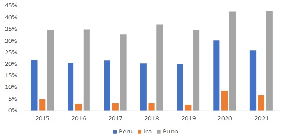 Puno es la región más pobre del Perú. De cada diez habitantes, cuatro sufren pobreza monetaria, es decir sus ingresos son insuficientes para cubrir una canasta básica. En relación con los servicios básicos, en las zonas rurales no cuentan con electricidad ni saneamiento, o cuentan con un servicio precario. El ingreso mensual promedio de para la región de Puno para el 2021 es de S/ 805, el segundo más bajo del país después de Huancavelica. Las principales actividades económicas en la región es la actividad agrícola y pecuaria, mismas que se desarrollan con tecnologías tradicionales, factor que la mantiene como la región menos competitiva en relación con el pilar de entorno económico (Figura 2) (Fuentes, Gonzales, Crisólogo, Manrique, Herrera y Chang, 2022).