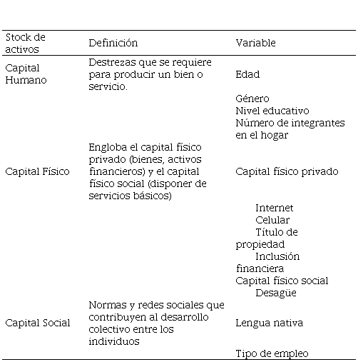 El stock de activos está integrado por el capital humano; físico y social a continuación se detallan los activos usados para la presente investigación (tabla 1) (Attanasio y Székely, 2001).
