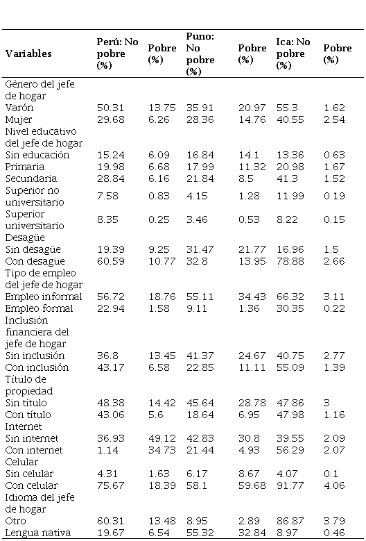 Los datos considerados fueron extraídos de la Encuesta Nacional de Hogares (ENAHO) del 2021, elaborado por INEI, que proporciona información del nivel de vida de los hogares Perú, con una distribución muestral para la región de Puno de 1040 hogares y para Ica de 1159 hogares. La Tabla 2 presenta las estadísticas resumidas centrándose en las variables según la condición de pobreza que se utiliza en el análisis empírico. En la tabla no se incluyó la edad del jefe de hogar ni la cantidad de integrantes del hogar por ser variables discretas.