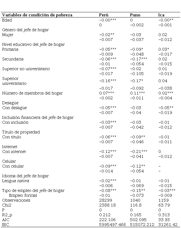 Capital social, los resultados obtenidos sobre el tipo de empleo del jefe de hogar muestran que en Puno e Ica el hecho de que el jefe de hogar labore en un empleo formal aminoran la probabilidad de ser pobre en un 15 % y 3 %, respectivamente y la variable en mención es altamente significativa en las regiones de estudio. En relación con la lengua nativa del jefe de hogar (aymara, quechua u otra lengua nativa), para las regiones de Puno e Ica disminuye la probabilidad de ser pobre en 1%.