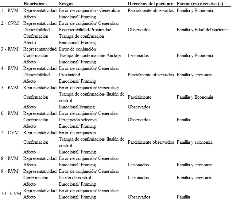 Los factores encontrados en las respuestas de los participantes se expondrán en una tabla con las heurísticas y los sesgos identificados; asimismo, se expondrá si se lesionaron o no los derechos de los pacientes, haciendo mención que si fueron parcialmente observados es porque fueron regresados a su domicilio por falta de cupo o disponibilidad de espacios en el hospital, finalizando con los factores decisivos en la toma de sus decisiones.