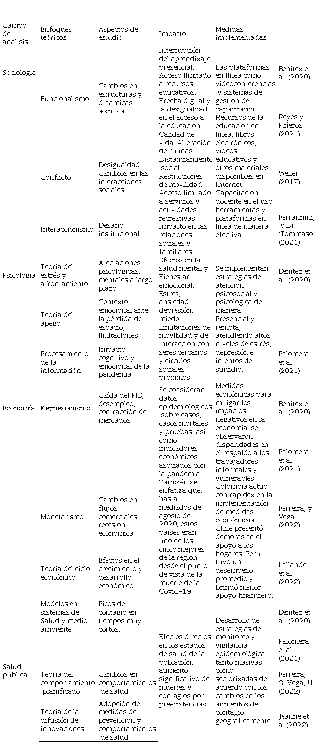impacto de la pandemia de COVID-19 en la competitividad de la Alianza del Pacífico puede ser analizado a través de diferentes enfoques teóricos, como la exposición al mercado internacional, la exposición a la integración económica y la globalización. Estos enfoques proporcionan marcos conceptuales para entender cómo la pandemia ha perturbado los aspectos comerciales y económicos de la Alianza. Además, la innovación social y productiva son habilidades desconocidas que contribuyen a la competitividad de las medianas empresas. Al integrar estrategias en los sistemas administrativos, las empresas pueden adaptarse mejor a los desafíos planteados por la pandemia y, además, fortalecer su posición competitiva en el mercado regional (Buelvas y Alegría, 2020b).