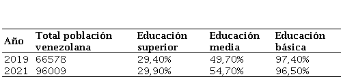 Se aprecia que la población migrante de Venezuela se ha hecho inmersa en el transcurrir del tiempo y de acuerdo con los datos encontrados en Terridata del DNP se realiza la verificación del nivel académico de los años 2019 y 2021 lo cual facilita analizar la capacidad de producción de acuerdo con la tabla 1 y la gráfica 1 respecto al nivel educativo de migrantes provenientes de Venezuela en el departamento de Cundinamarca.