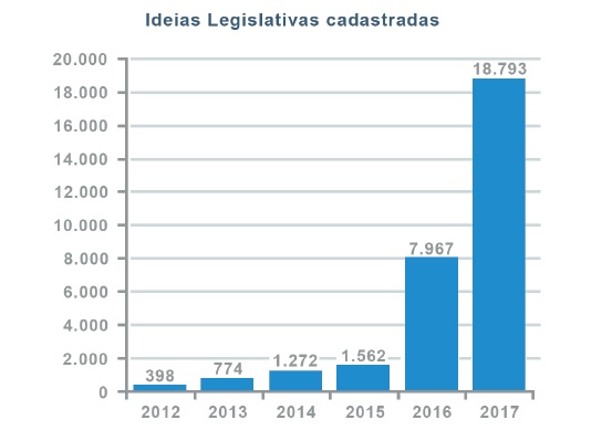Apesar do exponencial crescimento da participação dos usuários na elaboração e apoio das ideias legislativas, até setembro de 2017 somente uma única proposta sofreu a conversão em Projeto de Lei, devendo passar pelo procedimento legislativo cabível. Tratase do PLS nº 100/2017, o qual prevê a proibição expressa da adoção de franquias de consumo na internet fixa, alterando o art. 7º da Lei nº 12.965/2014 (Marco Civil da Internet).