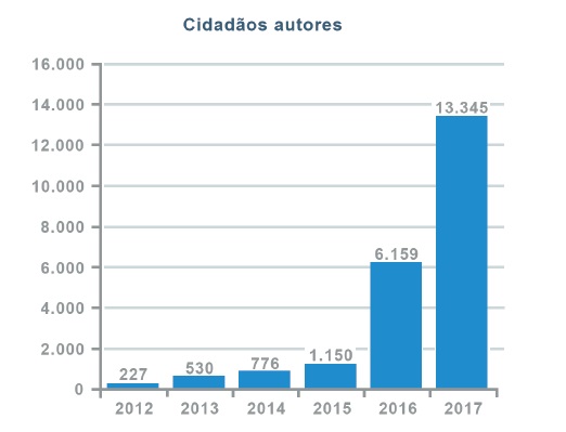 Igual razão apontam os relatórios do Senado Federal a essa distinção de usuários. De fato, ao se analisar o número de propostas (tabela 01) com base no cadastro dos usuários (tabela 02), temse um menor número de cidadãos autores que ideias legislati vas iniciadas. Significa, portanto, que até 5.448 ideias legislativas do ano de 2017 foram escritas por participantes já autores de outras proposições normativas, evidenciando um comportamento muito mais ativo de cidadãos específicos.