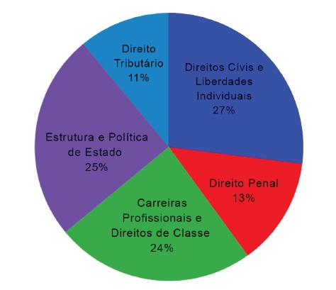 Por fim, relacionandose com o rol das Ideias populares, passase àquelas abertas que atingiram mais de mil apoios até a supracitada data e as que atingiram mais de 20.000 apoios e aguardam parecer da CNH (gráfico I). Elas podem ser divididas entre as categorias (a) direitos civis e liberdades individuais, (b) Direito Penal, (c) carreiras pro fissionais e direitos de classe, (d) Estrutura e política de Estado, (e) Direito Tributário. Ao realizar o estudo por amostragem considerando as 75 Ideias Abertas mais popula res, nos termos da classificação acima, os resultados aparentes quantitativos se deram da seguinte maneira: 20 ideias no quadro (a), portanto 27%; 10 no quadro (b) portan to13%; 18 no quadro (c), portanto 24%; 19 no quadro (d), portanto 25% e apenas 8 no quadro (e), portanto 11%.