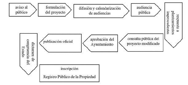 De manera resumida, la LGAHOTDU establece que el Municipio realice consulta for mal a su Entidad federativa justamente después de la publicación oficial del instrumen to de planeamiento urbanístico municipal41 y previo a la parte final del procedimiento que se refiere a la correspondiente inscripción registral.