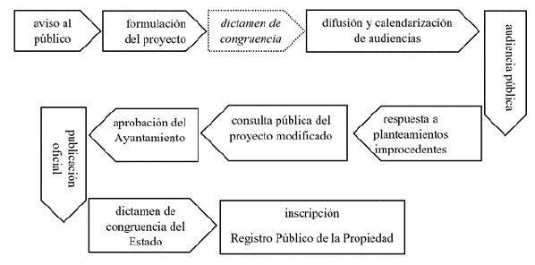 De lo contrario, el habitante del centro de población afectado por el dictamen de sentido incongruente emitido por la Entidad federativa sobre un concreto modelo urbanístico definido en sede municipal (aprobación del Ayuntamiento) vería publicado oficialmente e inscrito en el Registro Público de la Propiedad55 un instrumento de planeamiento urbanístico distinto al que fue aprobado por la autoridad urbanística municipal y modificado a través de un dictamen estatal sin que haya tenido oportunidad de conocer y participar de dicha modificación; lo que pondría en cuestión la fortaleza de los principios de participación ciudadana, derecho a la ciudad y transparencia en materia urbanística.