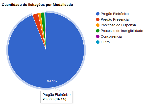 Por meio desse gráfico apresentado na Figura 1, é possível rapidamente constatar que a modalidade de licitação com maior número de ocorrência (freqüência) é Pregão eletrônico, correspondendo a 20.658 ou 94,1% das licitações levantadas.