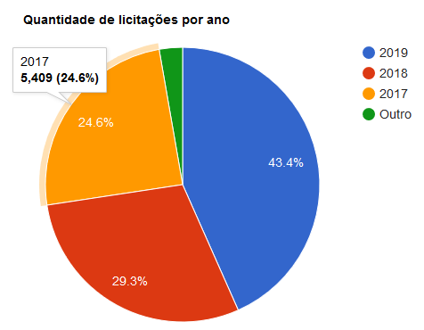 Em outro gráfico exposto na Figura 2, foi possível verificar que, entre os dados disponibilizados, a maior freqüência de licitações por ano ocorreu em 2019, com 43,4% dos registros disponibilizados, ou seja, aumento considerável em relação aos anos anteriores, 2018 (29,3%) e 2017 (24,6%).