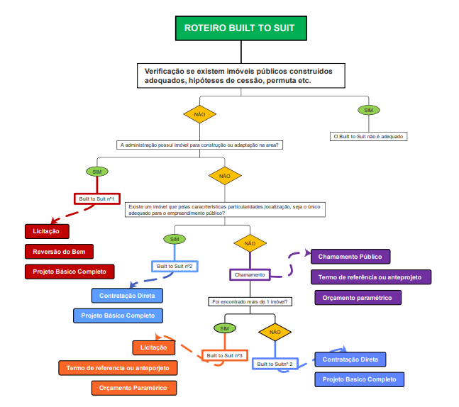 Com intuito de tentar sintetizar esse panorama geral, e sem querer restringir as hipóteses de formatação do built to suit, sugere-se o seguinte roteiro a ser seguido pela Administração Pública, com intuito de individualizar o desenho adequado da contratação pretendida:
