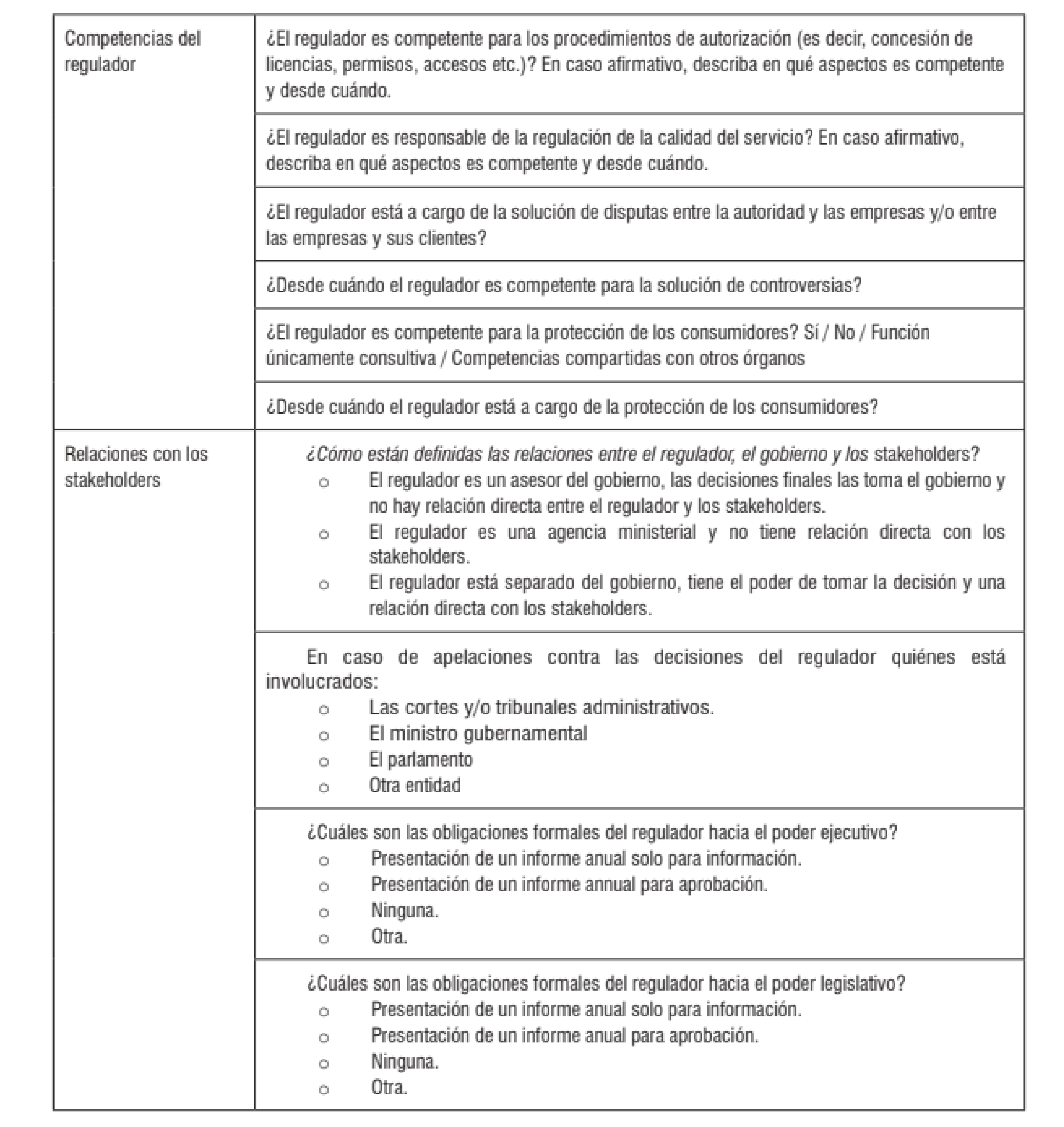 Cambini y Franzi[21] involucran para el establecimiento de la independencia de los reguladores el estudio de la atribución de competencias regulatorias, las relaciones con los stakeholders y la organización interna, de la siguiente manera: