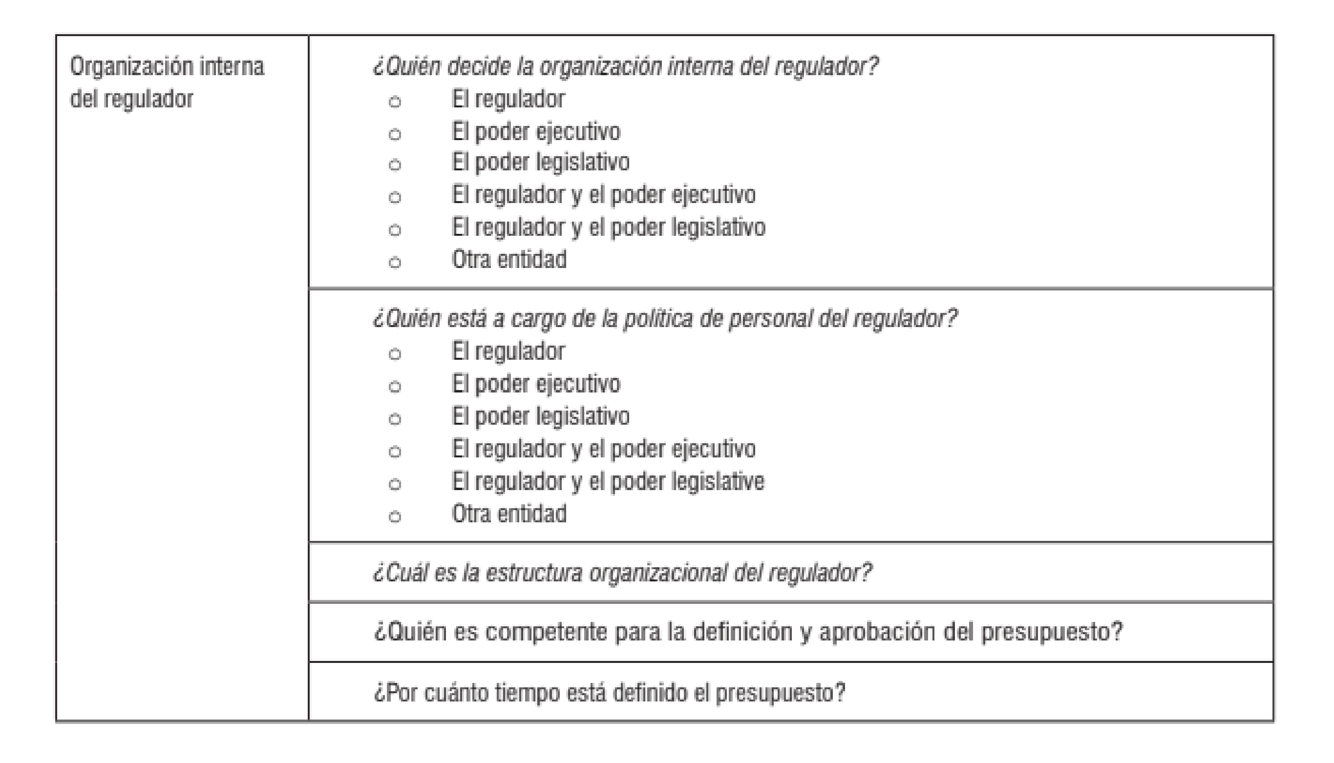 La tercera dimensión involucra la independencia financiera y organizacional de la autoridad regulatoria, también denominada indepedencia estructural, que implica que la autoridad regulatoria pueda determinar su organización interna y establecer sus políticas de personal, así como también fijar su presupuesto y gestionar su ejecución.