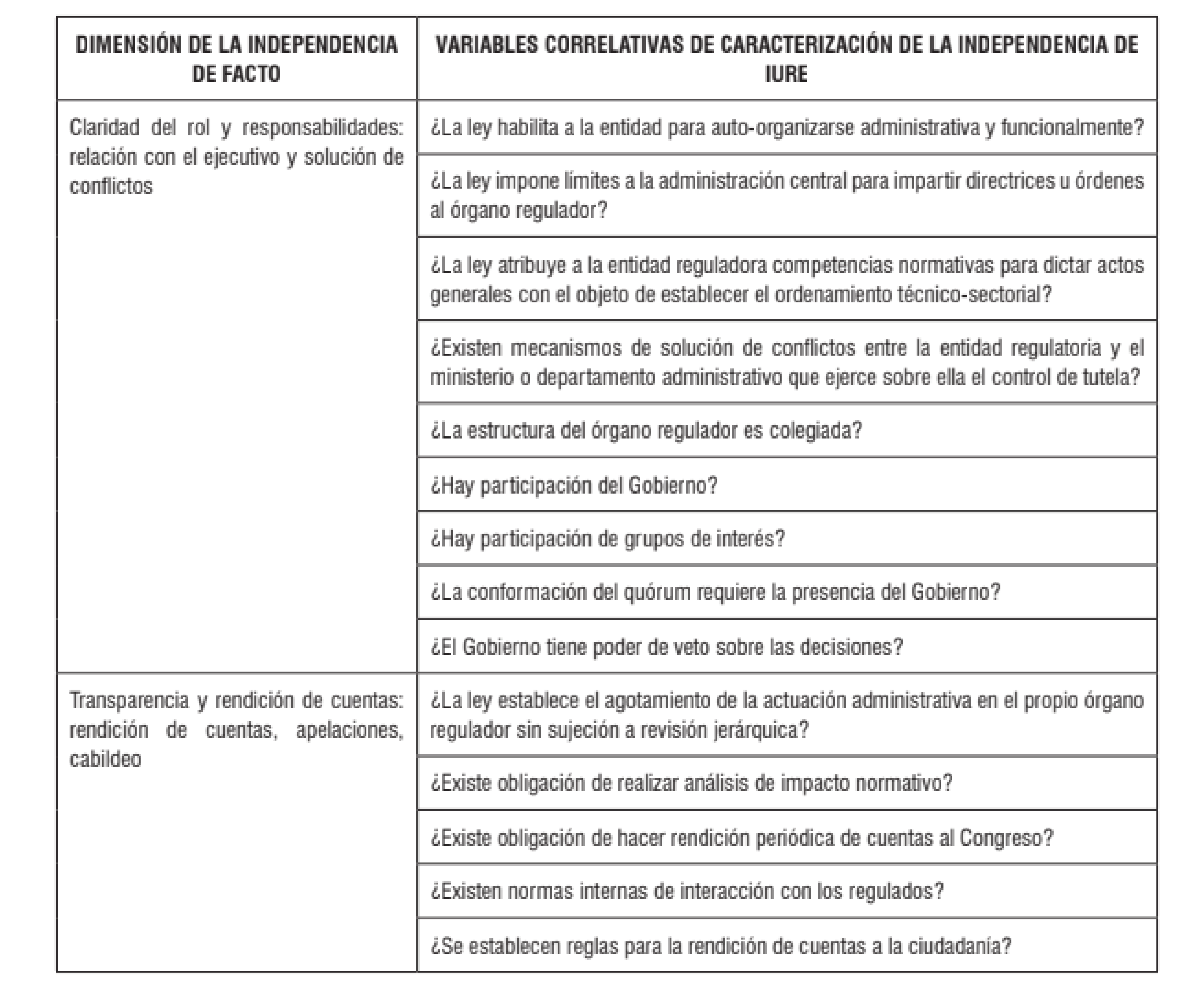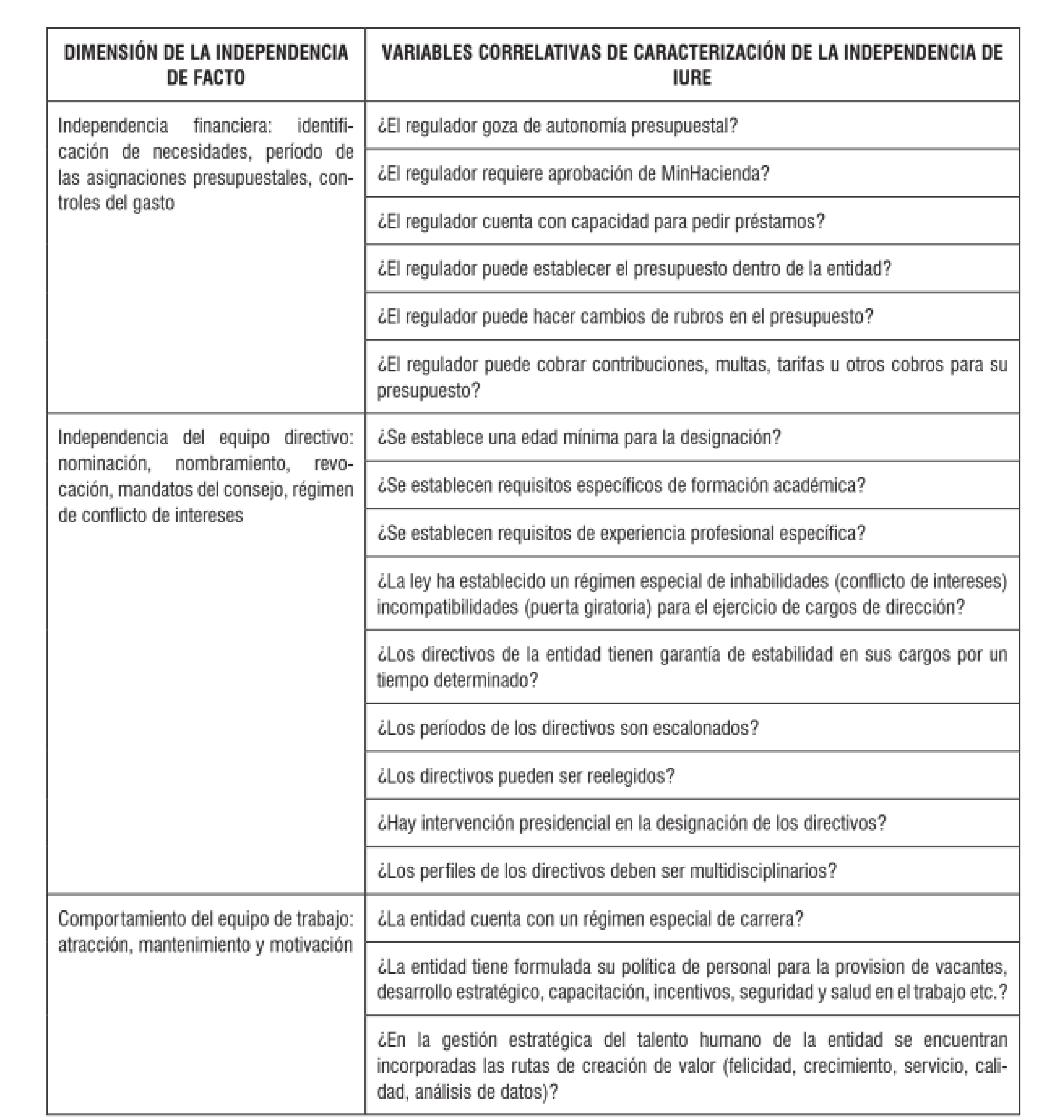 Conforme a esta conclusión, a partir del estado del arte ya consolidado, aplicado y validado sobre la medición de la independencia formal de los reguladores, se propone emplear esas categorías para contar con una línea de base que, combinada con análisis cualitativos, permita tener un punto de partida para valorar la independencia de facto, correlacionando las variables que han sido empleadas en diferentes estudios para la identificación y gradación de aquella con las dimensiones con las que la OCDE ha caracterizado la independencia de facto, de la siguiente manera: