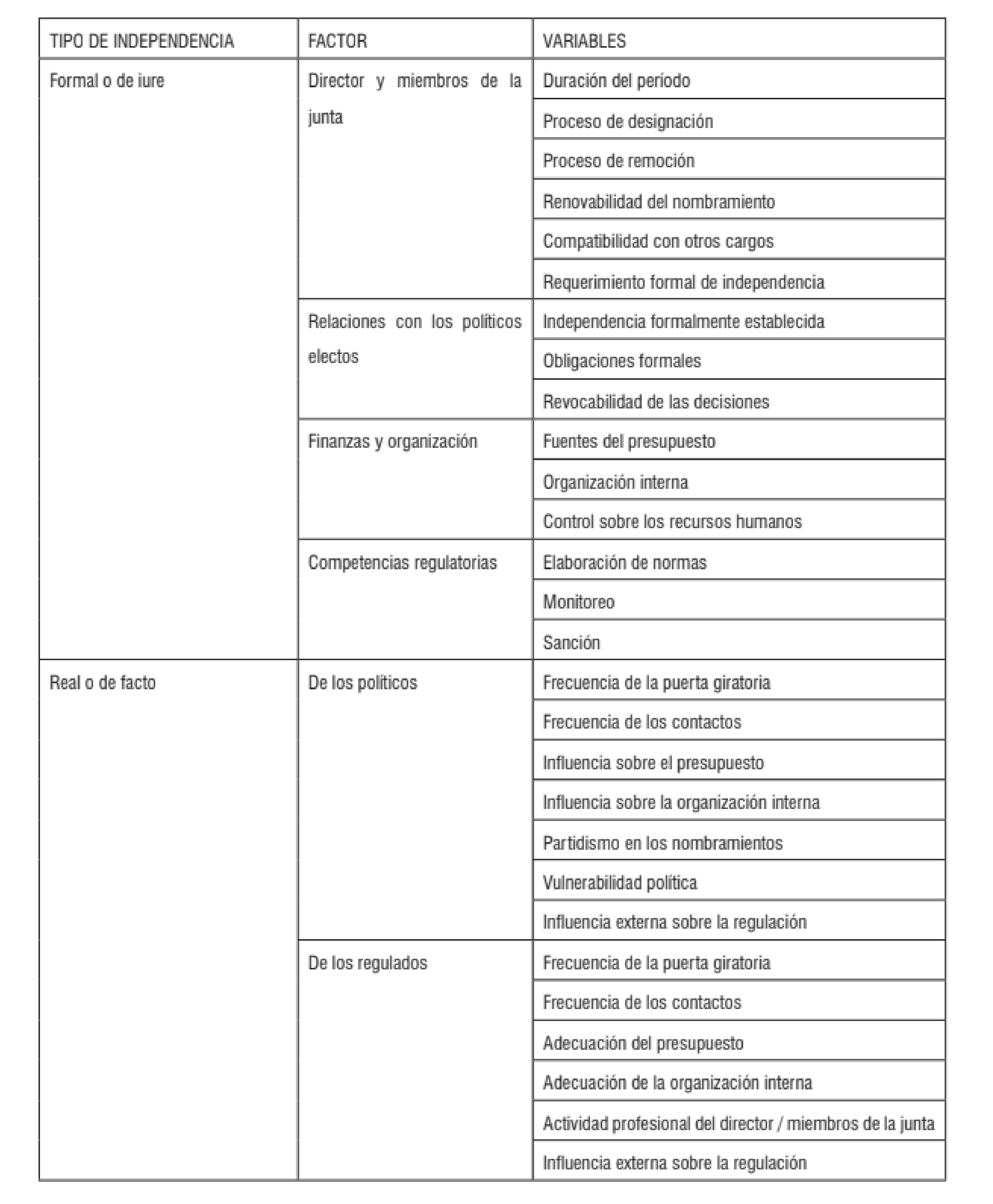 Conforme a este planteamiento, Gilardi y Maggetti[16] estiman que la independencia de facto de los reguladores en relación con los órganos del poder público dependerá de la frecuencia de las puertas giratorias, la frecuencia de los contactos, la influencia en el presupuesto, la influencia en la organización interna, el partidismo de las nominaciones, la vulnerabilidad política y la influencia externa en la regulación, y respecto de los regulados, en términos similares, dependerá de la frecuencia de las puertas giratorias, la frecuencia de los contactos, la adecuación del presupuesto, la adecuación de la organización interna, la actividad profesional del presidente/miembros de la junta directiva y la influencia externa en la regulación.