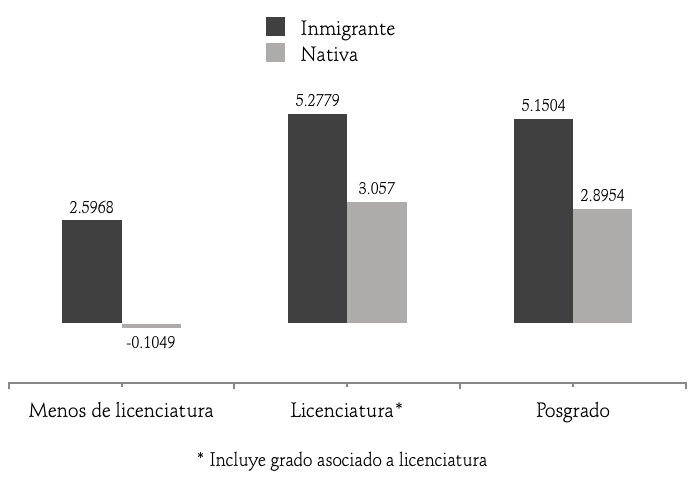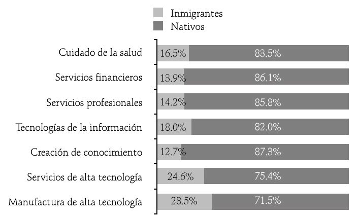 Asimismo, existe una fuerte correlación entre los inmigrantes formados en áreas ctim y el campo laboral en el que se desempeñan, en particular en ámbitos profesionales y en áreas asociadas con actividades de innovación. Queda claro, por tanto, que la reestructuración de los ecosistemas de innovación comandada por Estados Unidos ha dado lugar a una nueva migración calificada proveniente de países periféricos o emergentes, la cual está creciendo a un ritmo mayor que la migración en general y se nutre sobre todo por científicos y tecnólogos formados en áreas ctim.
