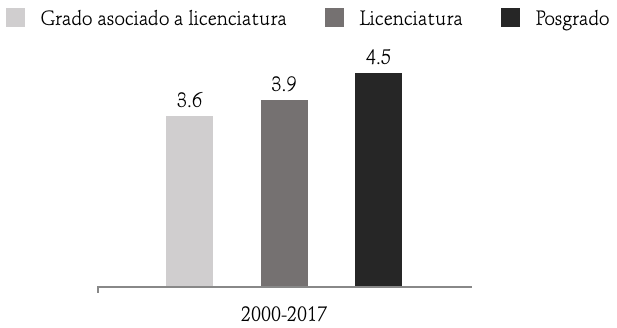 Además del impresionante respaldo en materia inversión pública en ciencia básica y aplicada (equivalente a 2.74 por ciento del pib en 2016), el gobierno estadounidense se distingue ―sobre todo a partir de la década de 1990― por desplegar una agresiva política de atracción de talento externo promovida por la National Science Foundation, acompañada por un vigoroso aliento a una política migratoria altamente selectiva. En efecto, no es casual que la migración calificada y altamente calificada dirigida a ese país haya crecido a una tasa que poco más que duplica la correspondiente a la migración sin estudios superiores, como se aprecia claramente en la gráfica 2.
