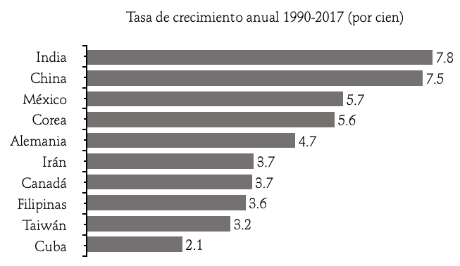 Enmarcado en esta tendencia, otro rasgo revelador del nuevo perfil de la inmigración altamente calificada dirigida a Estados Unidos es que el grueso proviene de países periféricos o emergentes, como se desprende de la gráfica 4. En efecto, 8 de los 10 principales países que aportan inmigrantes con posgrado provienen de naciones emergentes. Y más todavía: el incremento se produce, como cabría esperarlo, principalmente con inmigrantes formados en áreas directamente vinculadas con la innovación: ciencia, tecnología, ingeniería y matemáticas (áreas ctim).
