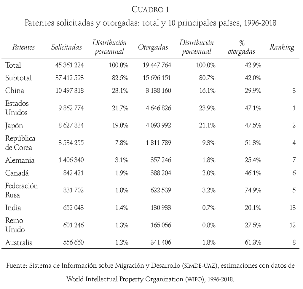 Cabe resaltar que, de acuerdo con la naturaleza y características del Sistema Imperial de Innovación descrito, Estados Unidos figura como la potencia capitalista líder en innovación a escala mundial, al contabilizar 23.9 por ciento del monto total de solicitudes de patentes registradas en la ompi entre 1996 y 2018; sin embargo, en el mismo lapso China superó a Estados Unidos en solicitudes de patentes: 23.1 por ciento versus 21.7 por ciento.