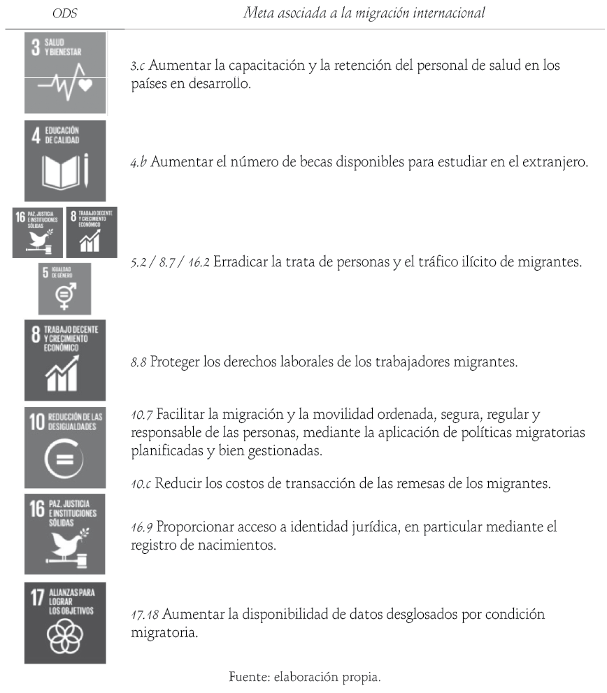 Concerniente a los precedentes más directos y en línea con la noción de desarrollo sostenible, la Agenda 2030 para el Desarrollo Sostenible, a diferencia de otras agendas globales de desarrollo, incorpora metas específicas asociadas con la migración, entre ellas la meta 10.7 que propone facilitar la migración, la cual sigue más o menos el mismo lenguaje y contenidos del Pacto, con el agregado de la propuesta de políticas migratorias planificadas y bien gestionadas. Al menos 6 de los 17 ods establecen metas directamente relacionadas con la migración internacional; 3 de éstas (metas 5.2, 8.7 y 16.2) fijan como objetivo para 2030 el poner fin con la trata y tráfico de personas, mientras que otras metas buscan garantizar los derechos laborales de los migrantes en los países de destino (8.8), la reducción de los costos de transacción de las remesas (10.c), la disponibilidad de becas para estudiar en el extranjero (4.b), la retención de los trabajadores de la salud en los países en desarrollo (3.c) y proporcionar acceso a identificación legal y registro de nacimiento (16.9).