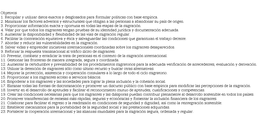 Sólo como ejemplo, el objetivo 1 enumera 11 acciones de distinto orden destinadas a fortalecer la evidencia de los procesos migratorios, en lo que constituye una antigua tradición en las Naciones Unidas. Difícilmente se puede estar en desacuerdo con propuestas de mejoramiento de estadísticas y fortalecimiento de la coordinación intersectorial nacional, o el apoyo a centros regionales de investigación y formación u observatorios sobre la migración, o la difusión de datos provenientes de distintas fuentes de información. øPero con qué recursos se puede apoyar a los países más necesitados? øQué plazos cabe darse para alcanzar alguna meta por ahora indefinida en cuanto al mejoramiento de la evidencia? El objetivo 1 cierra con la siguiente acción propuesta: «k) Cooperar con los interesados pertinentes en los países de origen, tránsito y destino para aumentar las investigaciones, estudios y encuestas sobre la interrelación entre la migración y las tres dimensiones del desarrollo sostenible, las contribuciones y aptitudes de los migrantes y las diásporas, y sus vínculos con los países de origen y destino» (Asamblea General de las Naciones Unidas, 2018:9).
