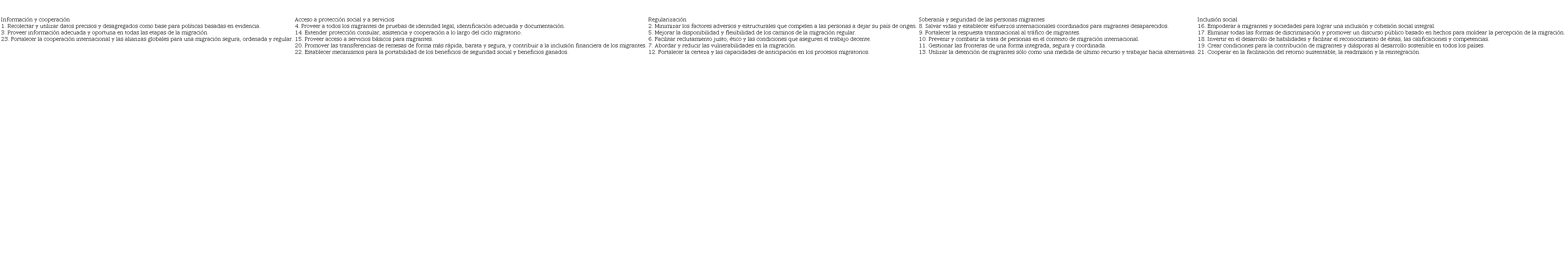 Las líneas de acción (variables en número y naturaleza) que posee cada uno de los 23 objetivos del Pacto derivan de los grandes temas identificados en los precedentes indicados y a partir de un largo trabajo realizado con la participación de los Estados miembros de las Naciones Unidas. En primer lugar, en términos de política pública, el objetivo 1 está centrado en recolectar y utilizar datos precisos y desagregados para diseñar y evaluar políticas basadas en evidencia. Es un objetivo elemental, pero a la vez es convocante, dado que se ha observado cómo algunos países que no se incorporaron al proceso del Pacto han tomado conciencia del beneficio que puede significarles participar de proyectos globales de recopilación de información, de intercambio y de manejo de datos de distinta naturaleza relativos a los procesos migratorios. Lo mismo se puede señalar respecto del objetivo 3, que establece la provisión de información adecuada y oportuna en todas las etapas de la migración, y del objetivo 23, que plantea fortalecer la cooperación internacional y las alianzas globales para una migración segura, ordenada y regular.