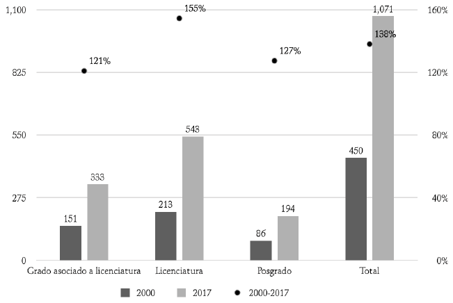 Un contraste significativo con el flujo total de migrantes mexicanos se muestra en la gráfica 1, donde se advierte una trayectoria marcadamente distinta de los migrantes mexicanos radicados en Estados Unidos que poseen títulos profesionales o de posgrado. En efecto, el total de connacionales con esa escolaridad aumentó en 131.8% entre 2000 y 2017, al pasar de 450 mil a 1 millón 71 mil personas, respectivamente. La desagregación de la información por grado académico describe intensidades distintas pero todas pautadas por el ascenso. Así, quienes ostentan el grado de maestría lograron un crecimiento de 212% al pasar de 44 mil a poco más de 138 mil maestros en los años de referencia, seguidos por aquellos que ostentan el nivel de licenciatura (155%) y el grado asociado a estudios superior de nivel licenciatura (121%). El nivel de posgrado observa un incremento de 127% al pasar de 86 mil a 194 mil.