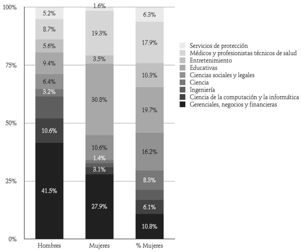 En efecto, datos de la acs del año 2017 sustentan la opinión anterior. En primer lugar, destaca como ocupación principal de las mujeres las actividades profesionales (56.5%), si bien entre los hombres esa actividad también es la más importante, la proporción es significativamente menor (46.0%). Las ocupaciones profesionales más importantes para las mujeres, es decir, donde ellas son mayoría, son educación (78.5%); médicos, profesionistas y técnicos de salud (71.2%); ciencias sociales y legales (64.7%). La distribución por tipo de ocupación muestra que ellas se concentran principalmente en ocupaciones de educación (30.8%); gerenciales, negocios y financieras (27.9%); y en profesionistas y técnicos de salud (19.3%). Estas tres ocupaciones concentran 78.1% de las mujeres mexicanas con estudios superiores. En cambio, los hombres tienen una representatividad en un número mayor de ocupaciones, pero menor dispersión ocupacional; tan sólo las ocupaciones de Gerenciales, negocios y financieras concentran 41.5% de los mexicanos con estudios superiores. Destacan las ocupaciones de ciencias de la computación, informática, ciencias e ingeniería que concentran 23.2% de los hombres y sólo 6.2% de las mujeres, ocupaciones claramente masculinizadas.