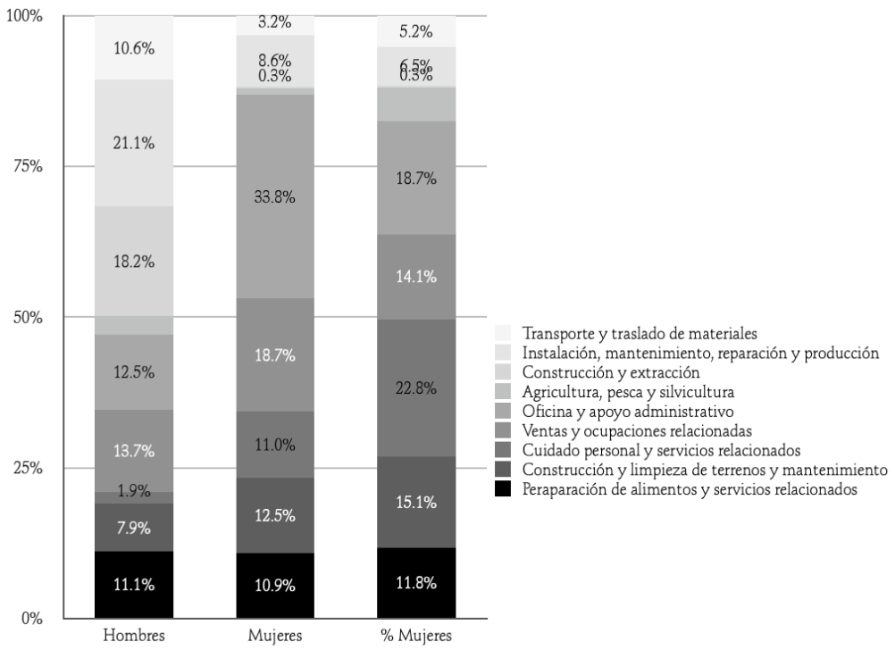 Por el racismo y la xenofobia de grupos de la sociedad estadounidense, algunos inmigrantes experimentan desvaloración de sus capacidades y otros más no pueden ejercer sus profesiones. Entre las ocupaciones clasificadas como no profesionales destacan, para el grupo de mujeres, las ocupaciones de oficina y apoyo administrativo (33.8%), ventas y ocupaciones relacionadas (18.7%), y construcción, limpieza de terrenos y mantenimiento (12.5%); estas tres ocupaciones no profesionales concentran 65.0% de migrantes del género femenino (gráfica 3). Las ocupaciones claramente feminizadas son cuidado personal y servicios relacionados (80.8%), así como ocupaciones de oficina y apoyo administrativo (66.5%). Nuestros datos confirman lo ya referido por Parella relativo a que la segregación ocupacional afecta directamente a la mujer inmigrante, independientemente de sus cualificaciones laborales, debe comprenderse desde la triple discriminación que enfrentan por ser mujer, inmigrante y trabajadora (Parella 2003, citado en Canales, 2014).