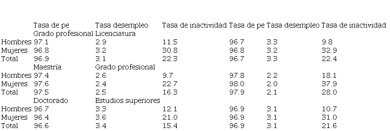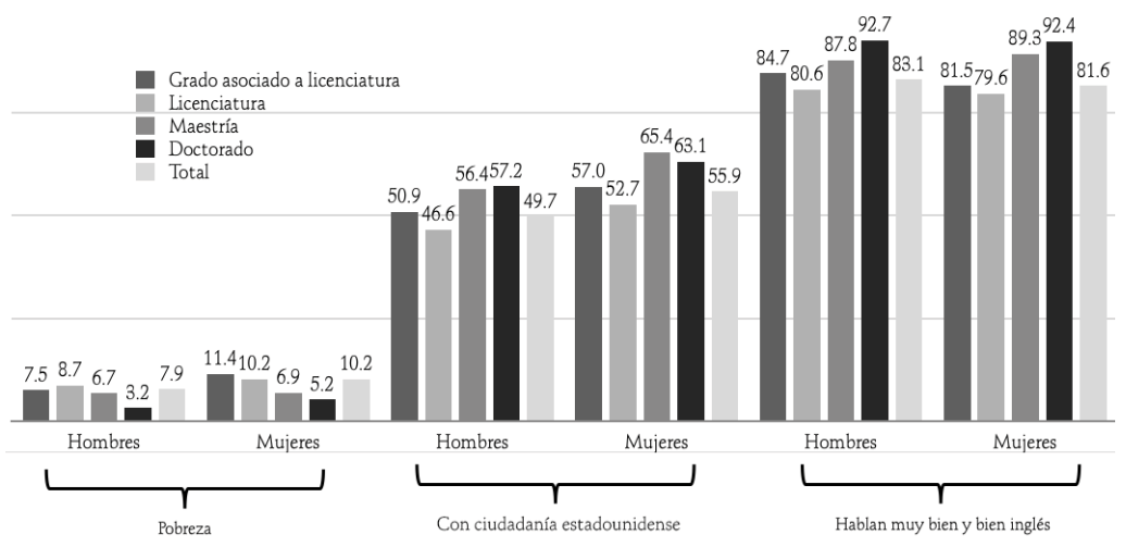 Escolaridad. La globalización ha transformado al conocimiento en el activo más valioso del desarrollo. Estados Unidos es sede de esa transformación, y ahí el capital escolar, incluyendo las habilidades y destrezas digitales, juega un papel decisivo en la competitividad en el mercado laboral, hecho que condiciona la posición en el empleo y la movilidad. A los desafíos que enfrenta el trabajador nativo en el vecino país del norte, los inmigrantes nacidos en México que laboran allá agregan la discriminación étnica, y las mujeres mexicanas, además, las injusticias a causa del género. Los datos recientes muestran que el capital escolar se está transformando es una estrategia femenina que contrarresta la doble desventaja: 75.6% de ellas posee título profesional, representan 54.5% del total de connacionales con esa escolaridad; y entre quienes poseen posgrado, 27.6% son varones y 24.4% mujeres, es importante subrayar que en este grupo de connacionales con posgrado la mitad son mujeres.
