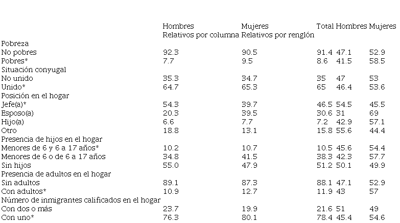 Posición en el hogar. Ser jefe del hogar, cónyuge, hija o hijo implica un conjunto de responsabilidades en la organización familiar y los arreglos para la vida doméstica, así como apoyos para la realización de los planes de vida de sus integrantes, más aún en los hogares en la etapa de expansión, esto es por el nacimiento o crecimiento de los hijos. Es probable que el desempeño del rol de madre y esposa reduzca la probabilidad de la mujer de incorporarse al mercado laboral, ya sea en tiempo completo o parcial. La tasa de inactividad de las mujeres inmigrantes con hijos es de 32.7% y la de quienes no tienen descendencia de 24.8%.