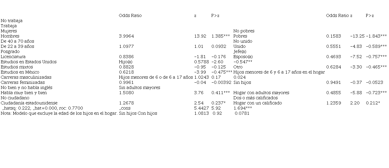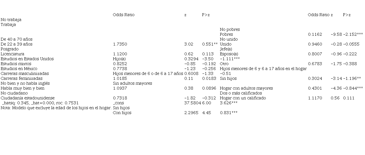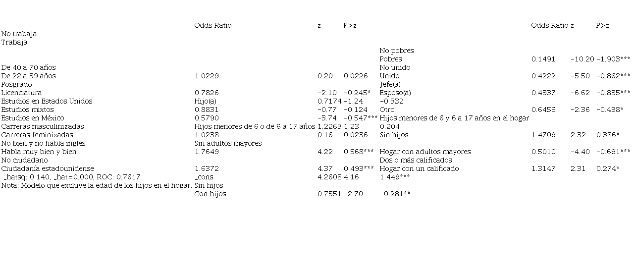 Así, queda abierta la interrogante sobre la influencia de cada una de las variables mencionadas en la probabilidad de que las connacionales con altas calificaciones se incorporen en el mercado laboral. Con el propósito de acercarse al conocimiento del impacto de esas variables, en seguida se presentan, en apretada síntesis, los resultados de tres modelos logísticos binomiales.