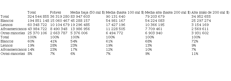 La distribución de la población blanca contrasta con la forma en que lo hacen las minorías étnico-demográficas. En el caso de la población de origen afroamericano, por ejemplo, aunque sólo representan 14 por ciento del total de los norteamericanos, conforman 23 por ciento de la población en situación de pobreza, a la vez que 17 por ciento de la población de clase media-baja. Asimismo, sólo componen 10 por ciento de la población de clase media alta y 7 por ciento de la clase alta, con ingresos por sobre los 200 mil dólares anuales. La población de origen latino muestra una situación muy similar. Si bien constituyen 19 por ciento de la población norteamericana, representan, no obstante, 28 por ciento de la población en situación de pobreza y 23 por ciento de la clase media-baja, con ingresos inferiores a 50 mil dólares anuales. Por el contrario, configuran sólo 13 por ciento de la población de clase media alta y 9 por ciento de las clases altas.