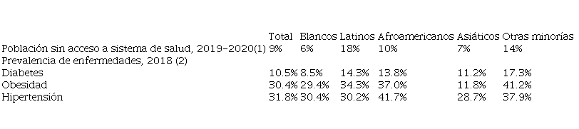 Junto a esta desigualdad en la protección en cuanto al acceso a los sistemas de salud, también existe una diferente prevalencia de enfermedades y padecimientos crónicos que, como la obesidad, hipertensión y la diabetes, constituyen además marcos de mayor vulnerabilidad a otras enfermedades y riesgos a la salud. De acuerdo con los resultados de la Encuesta Nacional de Salud de los Estados Unidos de 2018, las minorías étnico-raciales presentan sistemáticamente mayor prevalencia de ese tipo de enfermedades. Muestra de ello es que 8.5 por ciento de la población de origen blanco no latino padece de diabetes, en contraste con 14 por ciento aproximadamente de latinos y afroamericanos. Asimismo, la obesidad, que se ha convertido en una condición de riesgo de salud a escala mundial, en Estados Unidos no afecta a todos por igual; mientras 29.4 por ciento de blancos padece de obesidad, con un índice de masa corporal superior a 30, esta situación afecta a 34.3 por ciento de latinos y a 37 por ciento de afroamericanos. Concerniente a la hipertensión, otro mal de nuestra sociedad contemporánea, también es desigual según la condición étnico-racial, puesto que 30.4 por ciento de blancos no latinos tiene hipertensión, en comparación con casi 42 por ciento de afroamericanos.
