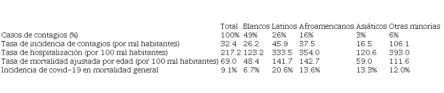 La desigualdad étnico-racial no sólo refiere la incidencia de la enfermedad sino también, y fundamentalmente, sus efectos referentes a las condiciones de salud y muerte que afectan a cada grupo social. Por un lado, la tasa de hospitalización es sustancialmente mayor en las minorías étnicas (en la población latina la cifra asciende a 333.5 hospitalizados por cada 100 mil habitantes y en la población afroamericana a 354), en comparación con la población blanca, cuya tasa de hospitalización comprende 123.2 personas por cada 100 mil habitantes. Asimismo, la mortalidad por covid-19 es significativamente desigual según el origen étnico-racial, pues la tasa de mortalidad de los blancos es de 48.4 muertes por cada 100 mil habitantes, en los latinos la tasa se eleva a 141.7 muertes y a 142.7 muertes en los afroamericanos (tasas ajustadas por estructura etaria).