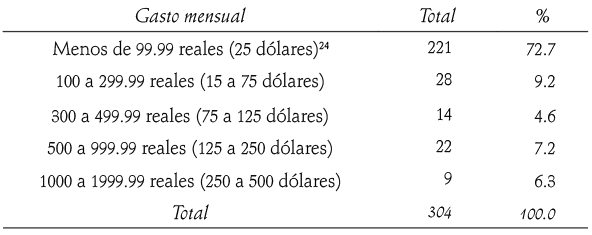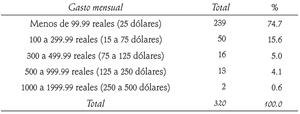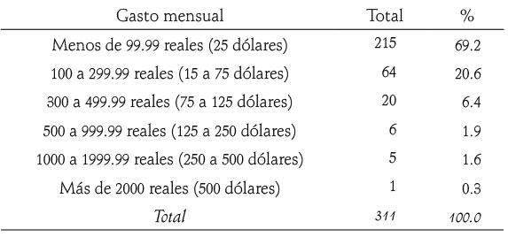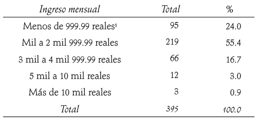 De los 395 encuestados que reportaron su retribución mensual, 24 por ciento percibe menos de mil reales brasileños (un aproximado de 250 dólares),23 55.4 por ciento dispone de entre los mil y 2 mil 999.99 reales, 16.7 por ciento posee un beneficio que va desde los 3 mil hasta los 4 mil 999 reales al mes, y sólo 3.9 por ciento gana 5 mil reales o más. En su conjunto, tenemos una pirámide económica con una fuerte concentración en los niveles medios o bajos, donde destaca el número de aquellos con una renta menor a mil reales, 24 por ciento del total (cuadro 6).