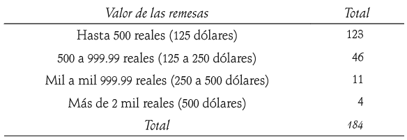 Un total de 304 encuestados reportó gastos en educación, de los cuales 72.7 por ciento destinaba menos de 100 reales (25 dólares) por mes a esta modalidad; de los 320 que informaron gastos en servicios sanitarios, 74.7 por ciento también consignaba una cantidad por debajo de 100 reales a estos servicios, y entre aquellos con gastos destinados al ocio, 69.2 por ciento asignaba menos de 100 reales al mes a esas actividades. En resumen, casi 70 por ciento de los refugiados declaró que su gasto en educación, salud y recreación es menor a 100 reales al mes, dato que coincide con el ingreso promedio informado (cuadro 6). Bajo estas condiciones, se creería que la emisión de remesas es bastante limitada; no obstante, existe. En efecto, al preguntarles sobre los lazos financieros que mantienen con sus países de origen, la mayoría de los 243 entrevistados (70 por ciento) envía, recibe, o envía y recibe remesas. Entre estas situaciones, se destaca el número de quienes solo reciben remesas, algo más de 24 por ciento (cuadro 10).