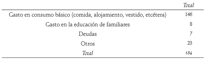La responsabilidad que pesa sobre los asilados se observa en la regularidad de capital enviado, su destino y su uso; pues, aunque son cantidades bajas, su remisión es regular y vital, ya que estos recursos se utilizan casi en su totalidad para costear las necesidades básicas. Por lo anterior, la búsqueda por preservar las relaciones financieras y sociales con la familia impacta de manera significativa en el día a día de los refugiados, porque las remesas les privan de recursos que podrían destinarse a la sanidad, a la educación y a actividades de esparcimiento. En ese sentido, la calidad de vida y los riesgos socioeconómicos que acarrea la condición de ser refugiado no dependen sólo de las sociedades (y economías) de los países de destino, sino que la propia historia de los refugiados, sus parientes y los espacios transnacionales en los que viven poseen adicionalmente un papel importante.