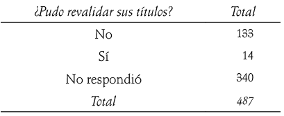 Aparte de los impedimentos ya mencionados, los refugiados titulados enfrentan otro problema: la escasa probabilidad de poder convalidar sus estudios, de cualquier nivel, realizados en el extranjero, pues de los 147 entrevistados sólo 14 pudieron ratificarlos en Brasil, cifra que se contrapone a los 133 que no lo consiguieron (cuadro 5).