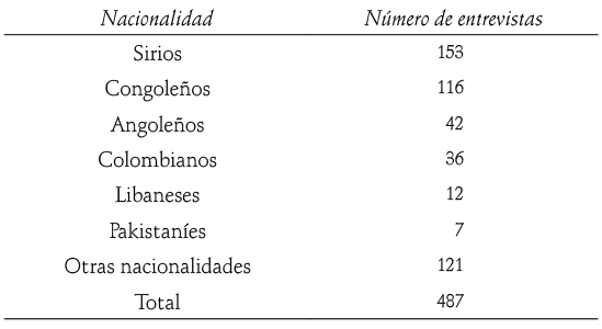 La valoración estadística indicó que 71.13 por ciento de los encuestados provenía de cuatro países: Siria (153), la República Democrática del Congo (116),18 Angola (42) y Colombia (36), por ende, las siguientes observaciones se enfocan en la realidad de los refugiados de estas naciones; no obstante, el objetivo final es establecer un punto de comparación para entender el comportamiento social y económico de los recientes grupos de haitianos y venezolanos.
