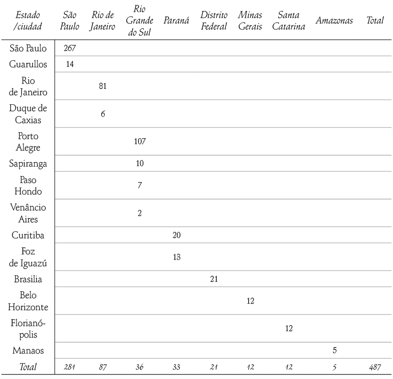 La lista de publicaciones en torno del refugio en la realidad brasileña es amplia17 y en ella dos temas son recurrentes: primero, la ley y la protección del refugiado y, segundo, las causas de los desplazamientos (inseguridad, empleo, crisis ambiental, etcétera) junto con los análisis referentes al impacto y a los procesos de integración de los grupos situados en diferentes ciudades en las sociedades de destino. En este segundo grupo se nota la ausencia, mencionada con anterioridad, de estudios relativos a economía, migración y remesas, mismos que se evaluaron en la investigación «El perfil socioeconómico de los refugiados en Brasil. Subsidios para el desarrollo de políticas» que tuvo lugar entre el 13 de junio de 2018 y el 20 de febrero de 2019, bajo la organización de acnur Brasil y de académicos pertenecientes a varias universidades brasileñas (Oliveira, 2020). Dicha revisión se constituyó a partir de ocho ejes, a saber: 1. Características sociodemográficas. 2. Procesos del desplazamiento. 3. Perfil laboral y habilidades profesionales. 4. Vivienda y gastos domésticos. 5. Vínculos con los países de origen y riesgos financieros. 6. Asociaciones y uso de servicios públicos. 7. Integración sociocultural. 8. Perspectivas futuras. Además, extrajo una muestra de 487 refugiados (cuadros 1 y 2) residentes en 14 ciudades de ocho entidades federativas: São Paulo, Rio de Janeiro, Paraná, Rio Grande do Sul, Distrito Federal, Minas Gerais, Santa Catarina y Amazonas, donde se concentra 94 por ciento de los refugiados bajo protección del gobierno brasileño. La asignación del número de entrevistas en cada una de las ciudades tomó en cuenta la participación respectiva.