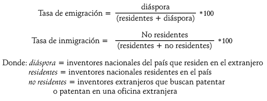 Los indicadores que se presentan en la sección «Líderes mundiales y latinoamericanos en patentes otorgadas (inventores)» se estiman para las patentes otorgadas, pues son las que efectivamente se pueden comercializar, además de que esta categoría ya ha pasado las pruebas que permiten considerarla una invención, por lo tanto, es innovadora y útil a la sociedad, con la intención de que esto último se cumpla cabalmente se debe producir y comercializar la patente. La tasa de emigración es una aproximación subestimada de la movilidad de inventores, se calcula con base en la metodología de Miguélez y Fink (2013) y la tasa de inmigración se estima de manera similar.