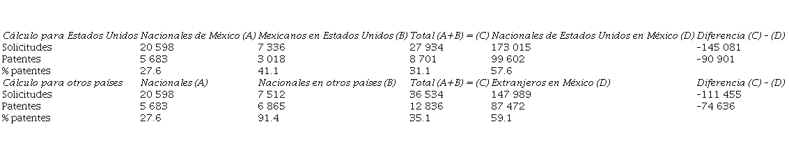 México es un expulsor neto de migrantes calificados y altamente calificados hacia Estados Unidos, paradójicamente en materia de patentes exhibe una alta dependencia de la innovación de extranjeros, sobre todo nacidos en ese país, lo cual resulta incomprensible si se considera que la oficina de México se encuentra entre las más atractivas para los inventores extranjeros. Ese comportamiento invita a reflexionar o indagar en torno del escaso éxito de los mexicanos con la finalidad de patentar sus invenciones en México, y si ese reducido éxito resulta ser un incentivo para buscar patentar fuera del país.