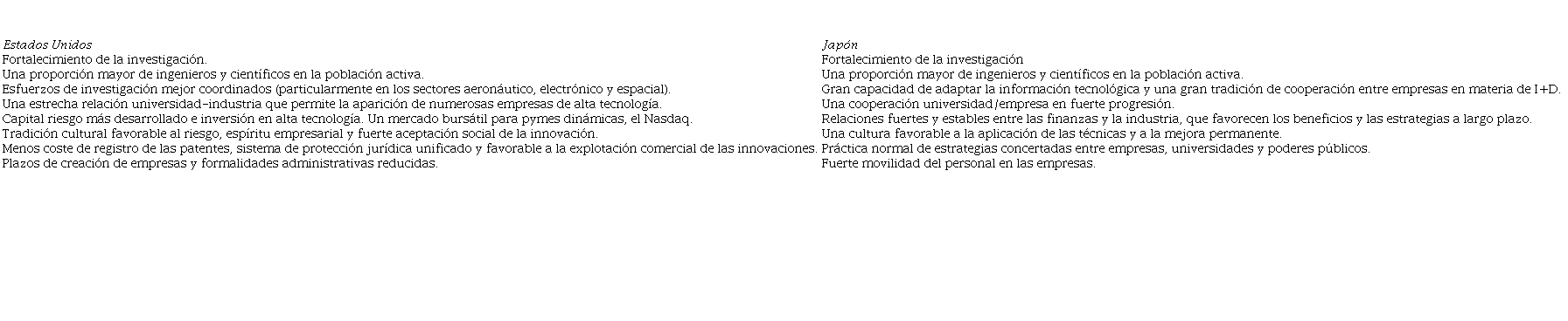 Al respecto, la Comisión Europea (1995:6) advierte que la calidad del sistema educativo, el marco reglamentario normativo y fiscal, el entorno competitivo, los socios de las empresas, la legislación sobre patentes y de la propiedad intelectual, la infraestructura pública de investigación y los servicios de apoyo a la innovación son factores inhibidores o favorables. La activación y fortalecimiento de esos factores puede fortalecer los sistemas de innovación en los países en desarrollo. En seguida se presentan algunas reflexiones de la Comisión impresas en el Libro Verde de la Innovación en el que destacan elementos que explican el éxito de Estados Unidos y Japón e identifican prioridades y acciones en busca de mejorar y hacer un entorno más favorable para la innovación; cabe resaltar que se resumen aquí por su utilidad para los países en desarrollo que están incursionando o fortaleciendo sus sistemas de protección de PI (cuadros 2 y 3).