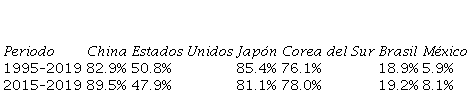 Los datos del periodo 2015–2019 respecto al correspondiente a los años 1980–2019 muestran que en términos relativos China recibió 33.9 por ciento (708 mil) del total de solicitudes emitidas por extranjeros, mientras que esa relación en el primer periodo fue de 25.2 por ciento (1.6 millones). A pesar de las diferencias absolutas dichos datos reflejan la popularidad que está ganando la oficina de China entre los inventores extranjeros. En ese orden de ideas, las oficinas de Brasil y México en el nivel mundial ocupan la octava y décima posición respectivamente, pero en Latinoamérica se ubican en la primera y segunda posición, seguidas de Argentina, Colombia y Perú. Este resultado es paradójico en el caso de México, ya que 45.8 por ciento de sus inventores busca patentar fuera del país y su tasa de inmigración asciende a 92 por ciento (cuadro 5).
